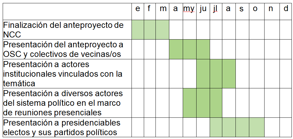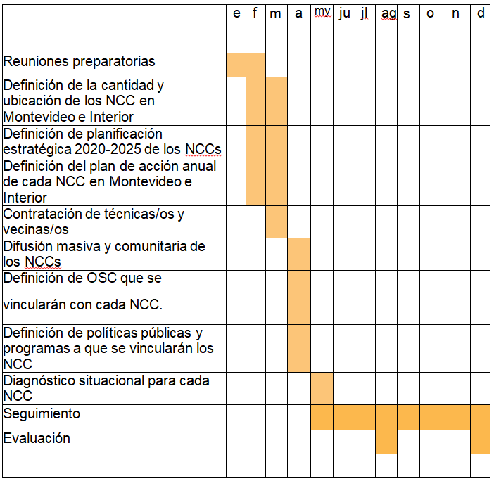 Se entiende imprescindible generar un mínimo de 8 NCC en los barrios de la periferia de Montevideo y 8 NCC en barrios de la periferia de ciudades capitales del Interior, para poder sistematizar la experiencia y sacar conclusiones del impacto, durante el proceso y finalizado el período 2025/2030.